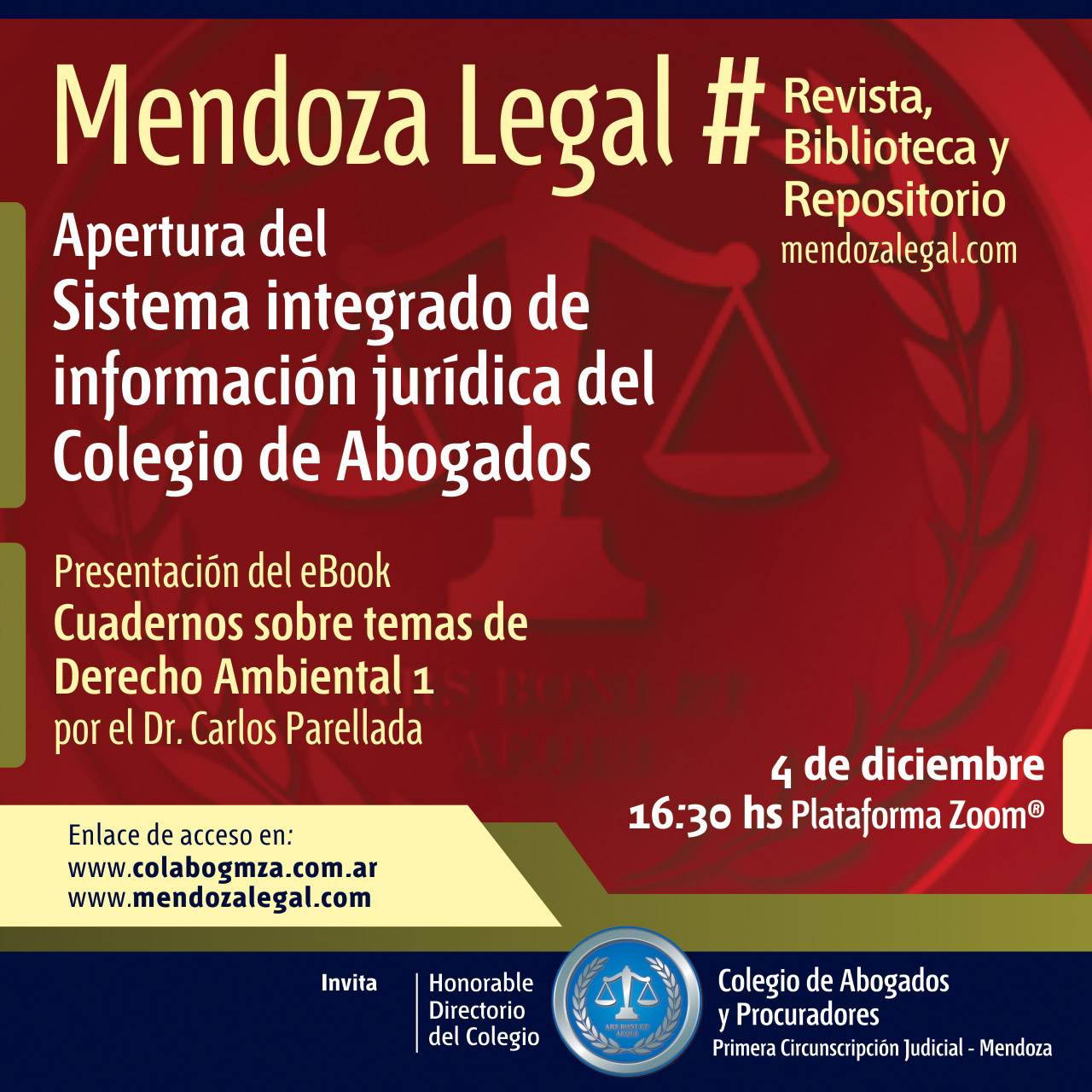 Será a través del Zoom del Colegio de Abogados y Procuradores de Mendoza, el miércoles 2 de junio a las 17. Es el segundo libro digital multiformato, de acceso libre, editado desde la plataforma de contenidos jurídicos del Colegio de Abogados, Mendoza Legal. Ya está abierta la inscripción en: inscripciones.colabogmza.com.ar