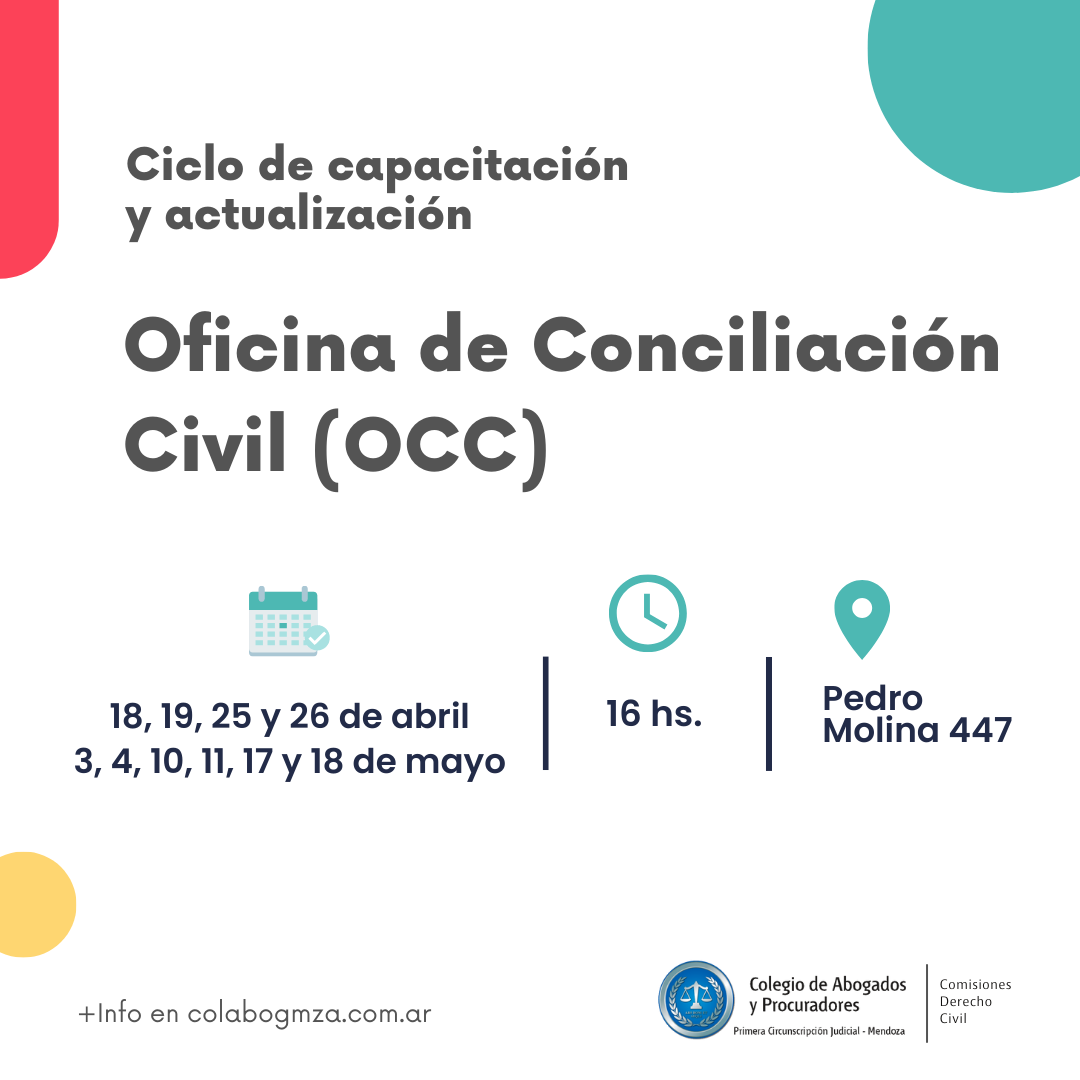 El próximo encuentro del ciclo denominado “Jornadas de capacitación teórico-prácticas sobre Oficina de Conciliación Civil (O.C.C)” destinado a profesionales del Derecho se realizará el jueves 30 de junio, de 15 a 19, en la sede del Colegio, ubicada en Pedro Molina 447 de la Ciudad de Mendoza. Estará a cargo del abogado y magíster en Derecho Procesal, Omar Fornetti; y el abogado, presidente de la Comisión de Derecho Civil del Colegio de Abogados, Pablo Enrique de Rosas, . Aunque es de destacar que el cupo para sumarse a esta capacitación ya está completo.