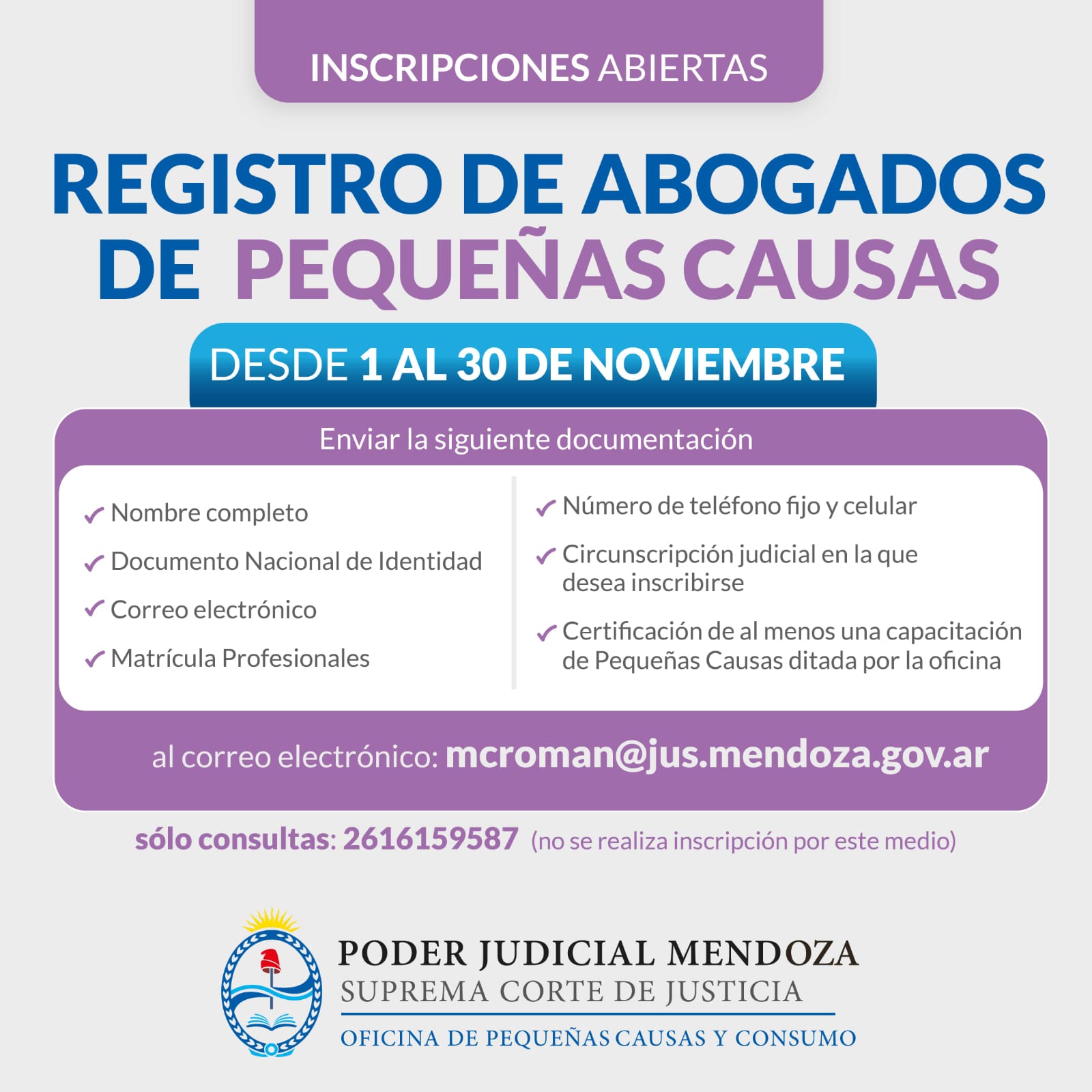 La Oficina de Pequeñas Causas y Consumo abrió la inscripción en el Registro de Abogados para aquellos letrados que quieran litigar en este tipo de causas. Los profesionales interesados deberán estar matriculados, tener un año de experiencia en el ejercicio de la profesión, haber participado y asistido en al menos una de las dos capacitaciones anuales que realiza la Oficina de Pequeñas Causas. Los que cumplan con estos requisitos tendrán tiempo hasta el 30 de noviembre para solicitar la inscripción por correo electrónico a: mcroman@jus.mendoza.gov.ar