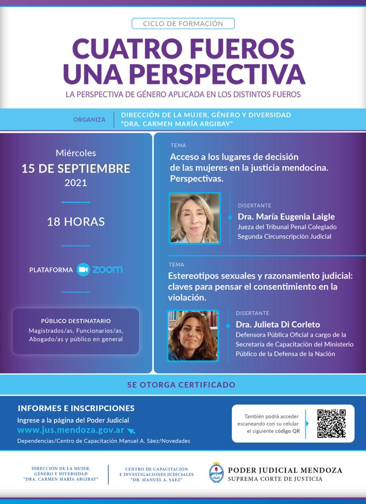 La Dirección de la Mujer, Género y Diversidad «Dra. Carmen María Argibay» y el Centro de Capacitación e Investigaciones Judiciales «Dr. Manuel A. Sáez» organizaron el Ciclo de Formación Cuatro Fueros Una Perspectiva. La Perspectiva de Género Aplicada en los Distintos Fueros. Se realizará el miércoles 15 de aeptiembre a las 18 a través de Zoom.