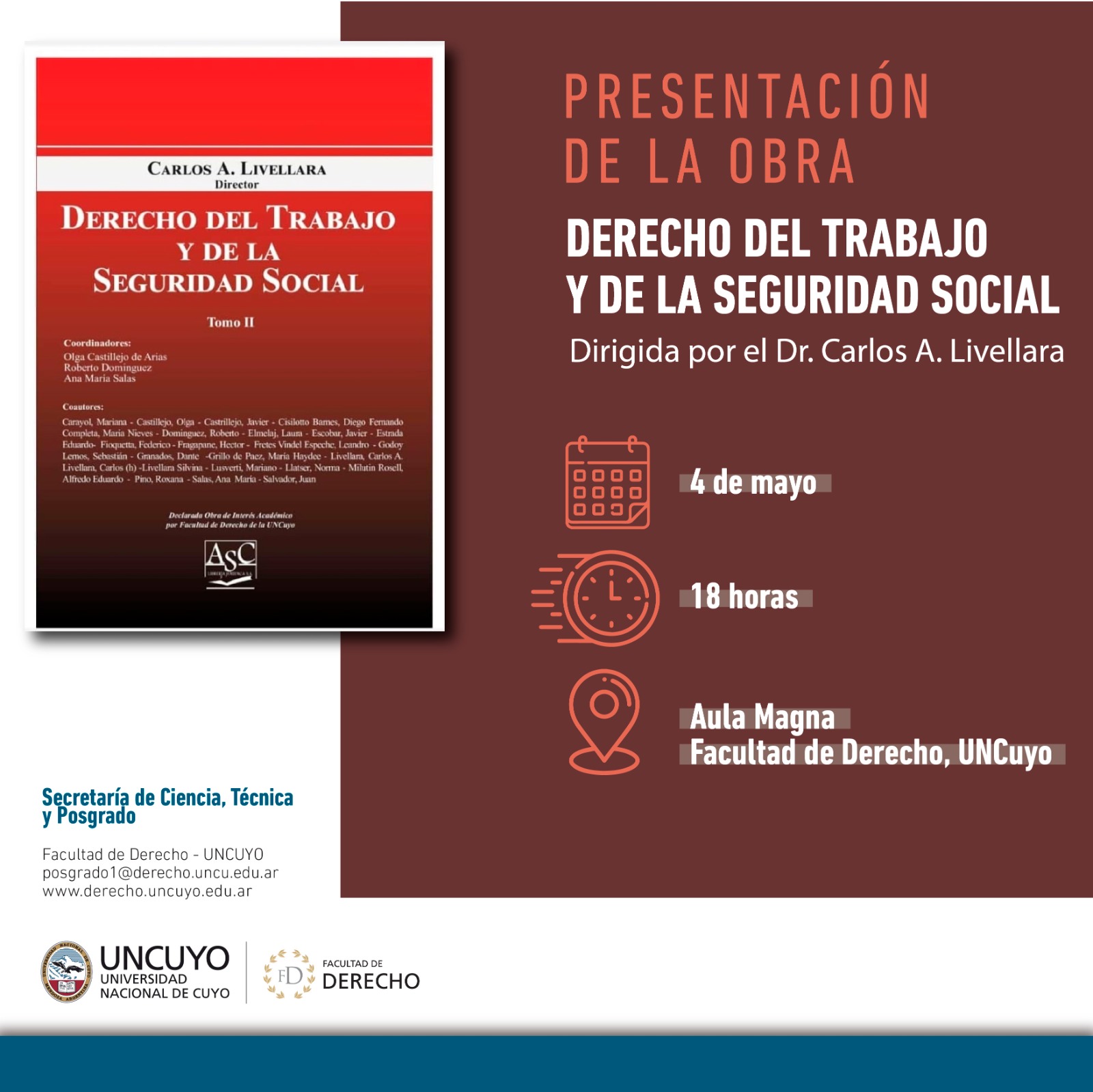 La Facultad de Derecho de la Universidad Nacional de Cuyo presentará la obra «Derecho del Trabajo y de la Seguridad Social», la cual fue declarada de «interés académico» por Res 462/22. La presentación estará a cargo de su director, Carlos Livellara, y será abierta al público general. El encuentro será en el Aula Magna de la Facultad de Derecho, el jueves 4 de mayo a las 18. Los interesados en participar pueden inscribirse a través del siguiente formulario web: https://docs.google.com/forms/d/e/