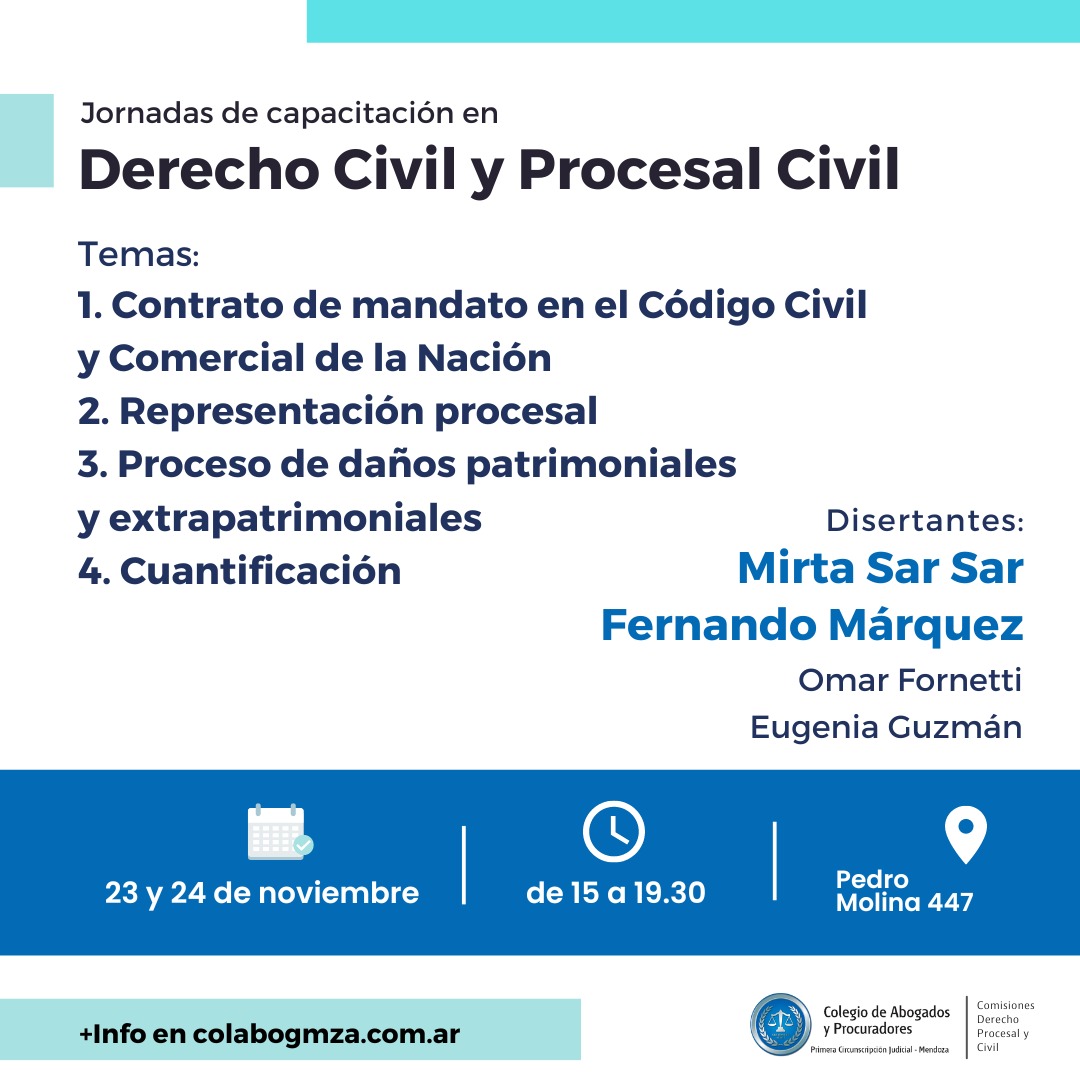 El miércoles 23 de noviembre se realizará la conferencia titulada “Contrato de mandato en el Código Civil y Comercial de la Nación y representación procesal”, a cargo de la profesora de Derecho Privado en la Universidad Champagnat, ex camarista y jueza de la Provincia, Dra. Mirta Sar Sar. Estará acompañada por el presidente de la Comisión de Derecho Procesal del Colegio de Abogados, Dr. Omar Fornetti.