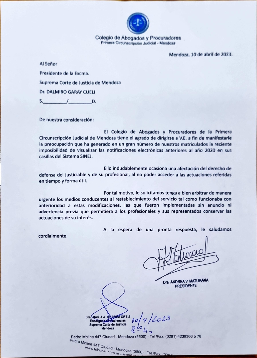Lo pidió el Directorio del Colegio de Abogados y Procuradores a la Corte el 10 de abril y lo reiteró el 26 del mismo mes ya que no recibió respuesta. Motivó los dos pedidos la preocupación que generó constatar el alto número de matriculados que no pueden visualizar las notificaciones electrónicas anteriores al año 2020 en sus casillas del Sistema SINEJ.