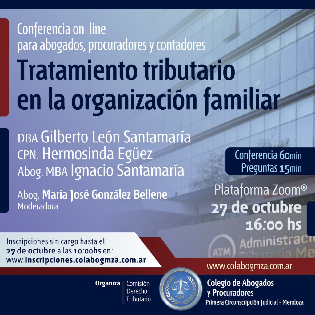 La conferencia on line forma parte de un ciclo de capacitación en Derecho Tributario. Está prevista para el martes 27 de octubre, a las 16 . Las inscripciones se podrán tramitar hasta el mismo día a las 10 en: inscripciones.colabogmza.com.ar