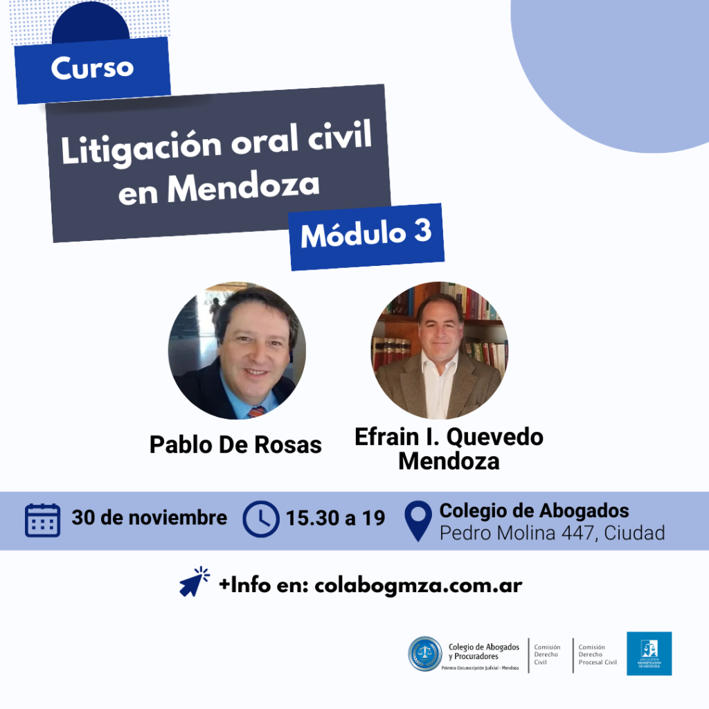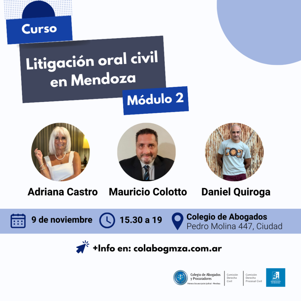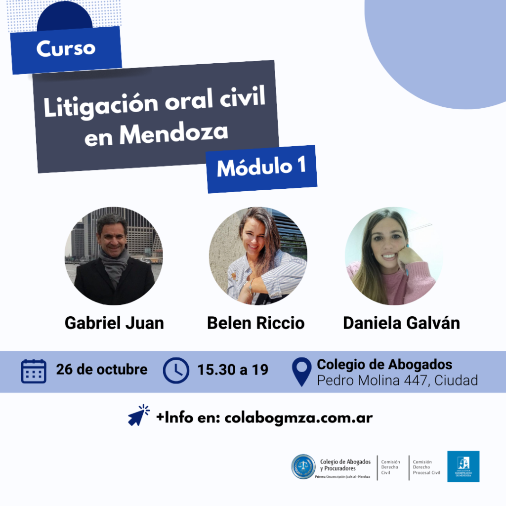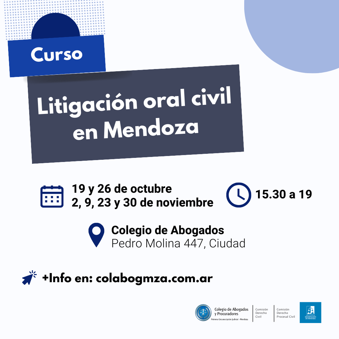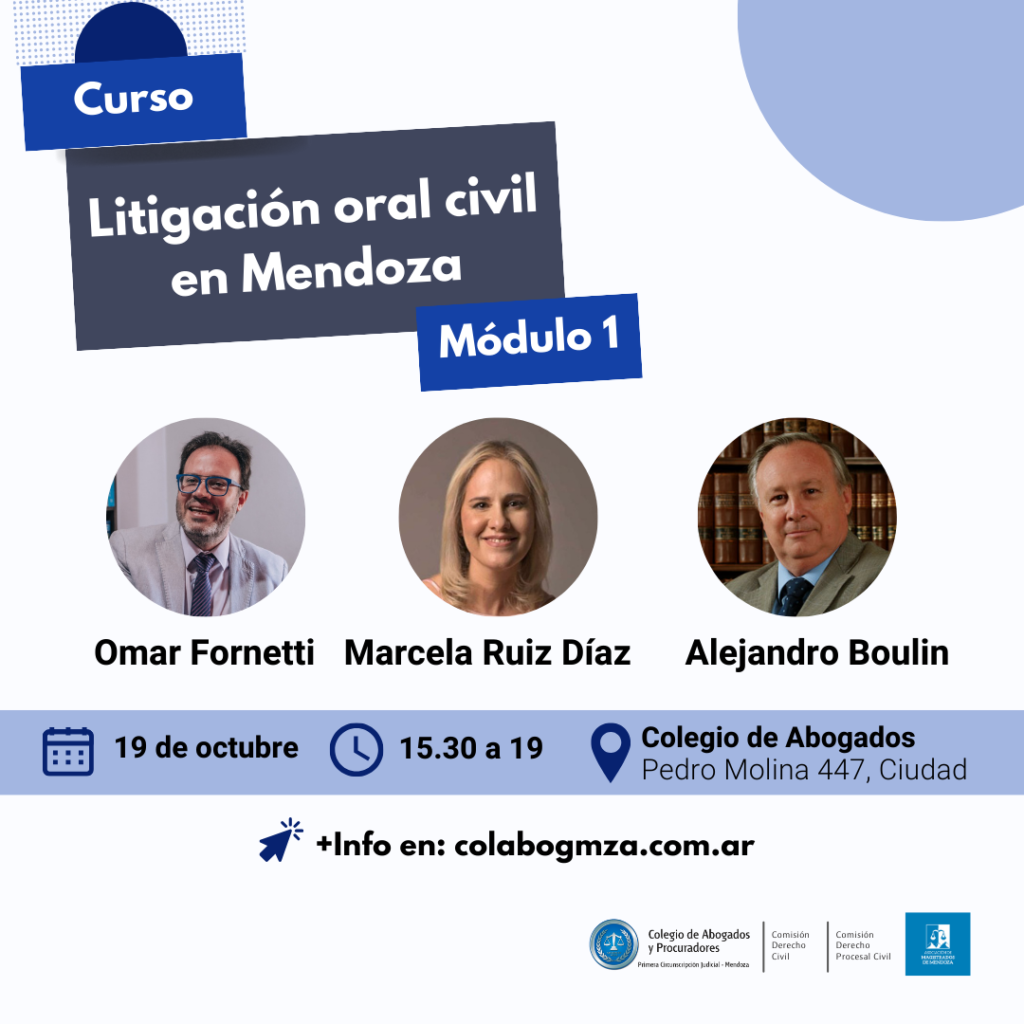 El jueves 19 de octubre, a las 15:30 hs, comenzará un ciclo de capacitación sobre «Litigación oral civil en Mendoza» en el Colegio de Abogados y Procuradores de la Primera Circunscripción. Está destinado a profesionales del derecho, estudiantes de abogacía e interesados en general, quienes podrán adquirir aspectos teóricos, prácticos y habilidades blandas en oralidad civil.