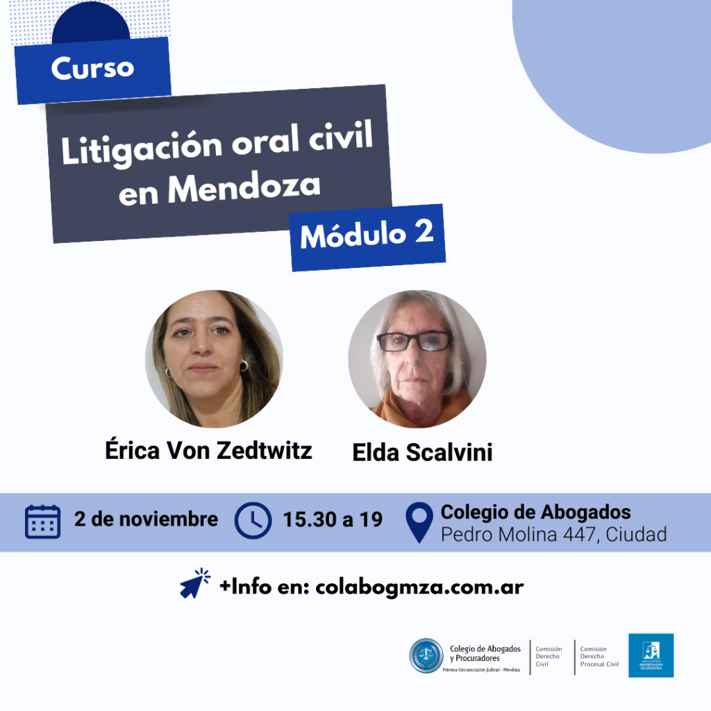 El módulo 2 comenzará el jueves 2 de noviembre con las disertaciones de la Sra. Jueza Dra. Érica Von Zedwidz sobre el tema «Demanda, contestación y terceros intervinientes en el proceso por audiencias del CPCCT», y la Sra. Jueza Dra. Elda Scalvini quien tratará el tema «Audiencia inicial en la justicia de paz letrada de Mendoza».