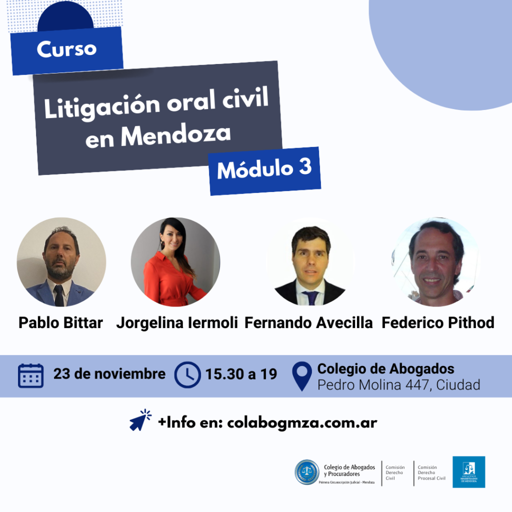 El módulo 3 dará comienzo el jueves 23 de noviembre con la conferencia-debate “Visión del abogado y del juez en la audiencia final del CPCCT” a cargo de los Sres. Magistrados Dr. Pablo D. Bittar, Dra. Jorgelina lermoli y Dr. Fernando Avecilla. Para finalizar esa jornada el Profesor Dr. Federico Pithod disertará sobre «Nulidades en la Oralidad Civil CPCCTMza».