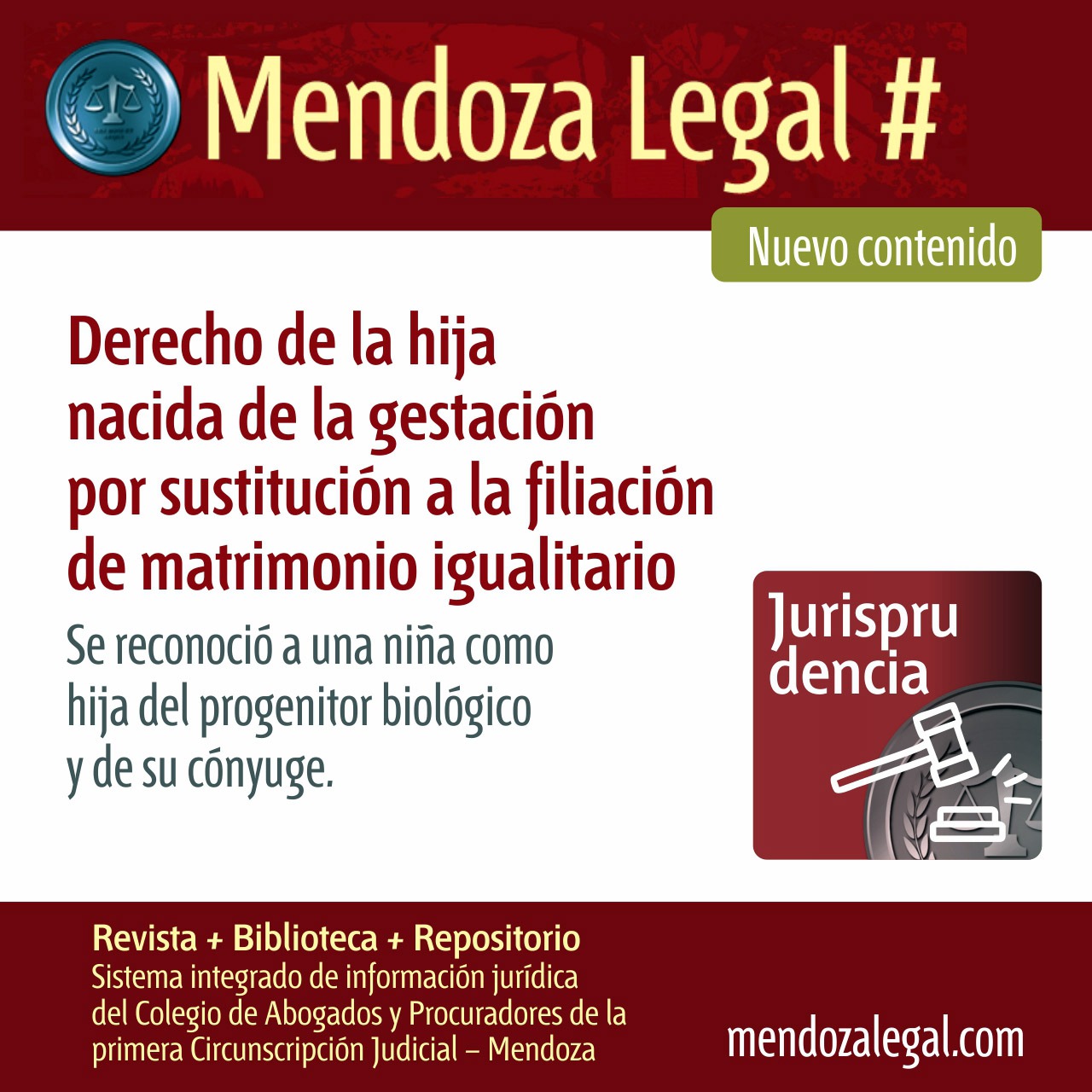 Mendoza Legal es el sistema integrado de información jurídica del Colegio de Abogados y Procuradores de la Primera Circunscripción Judicial de Mendoza. Una de sus últimas publicaciones ofrece un fallo del Juzgado de Familia de segunda Nominación de la ciudad de Córdoba que reconoció a una niña nacida por la técnica de reproducción asistida, denominada gestación por sustitución, como hija del progenitor biológico y de su cónyuge.