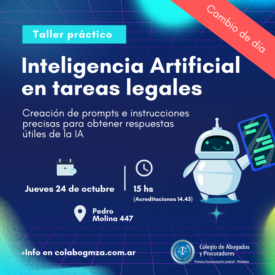 El jueves 24 de octubre, a las 15 en la sede del Colegio de Abogados ubicada en Pedro Molina 447 de Ciudad, se realizará un taller práctico sobre el uso de la Inteligencia Artificial en tareas legales. La capacitación, que será dictada por los abogados Mauricio Grinspan y Mariel Bolatti, tiene como objetivo familiarizar a los profesionales del Derecho con herramientas de IA y enseñarles a optimizar su uso en tareas habituales como la redacción de documentos, investigación legal y análisis de casos.