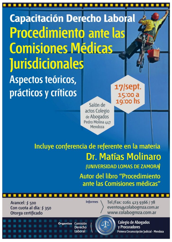La necesidad de colaborar en la difusión del procedimiento teórico-práctico ante las comisiones médicas motivó a la Comisión de Derecho Laboral a organizar a una jornada de actualización sobre estos aspectos de la temática. Para ello convocó a un profesional autor de numerosas publicaciones que rigen la materia, Dr. Matías Molinaro.