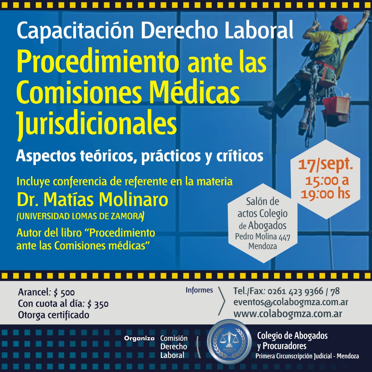 La necesidad de colaborar en la difusión del procedimiento teórico-práctico ante las comisiones médicas motivó a la Comisión de Derecho Laboral a organizar a una jornada de actualización sobre estos aspectos de la temática. Para ello convocó a un profesional autor de numerosas publicaciones que rigen la materia, Dr. Matías Molinaro.